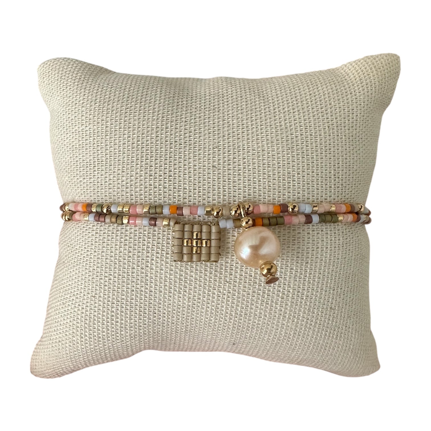 Hilo tejido con cuentas de cristal calibrado, aplicaciones en baño de oro 22k y perla cultivada.